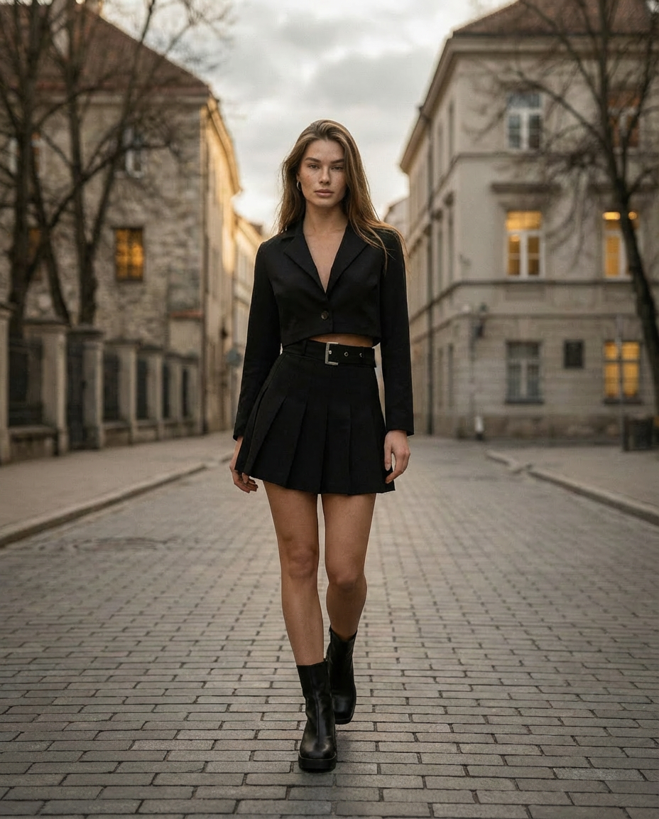 A chic two-piece ensemble that brings modern sophistication to classic tailoring. The cropped blazer paired with a pleated mini skirt creates a youthful yet polished look that transitions seamlessly from office to after-hours events. The included belt adds the perfect finishing touch to define your silhouette.