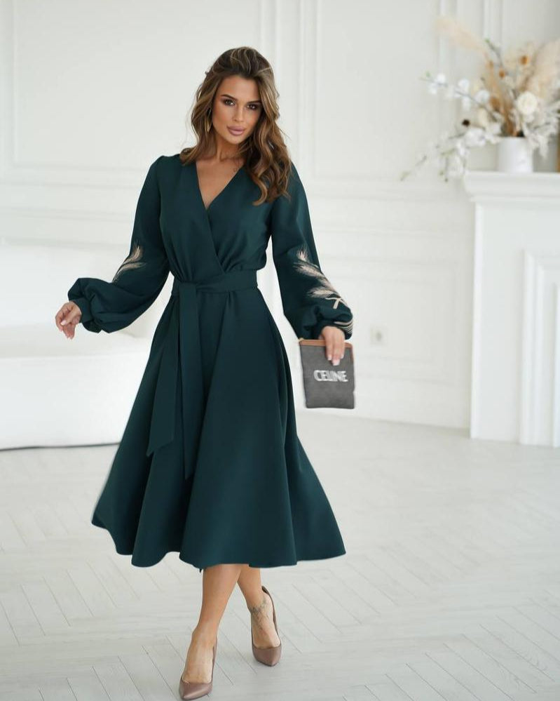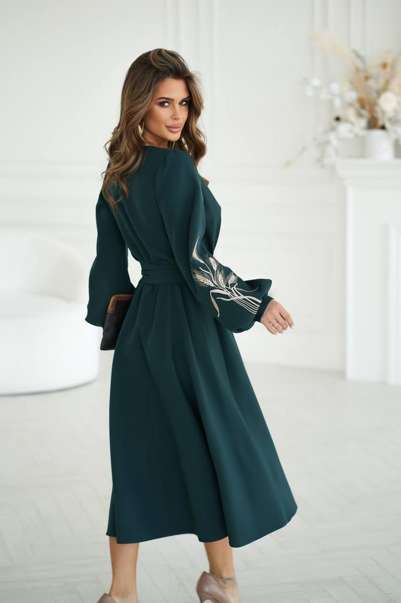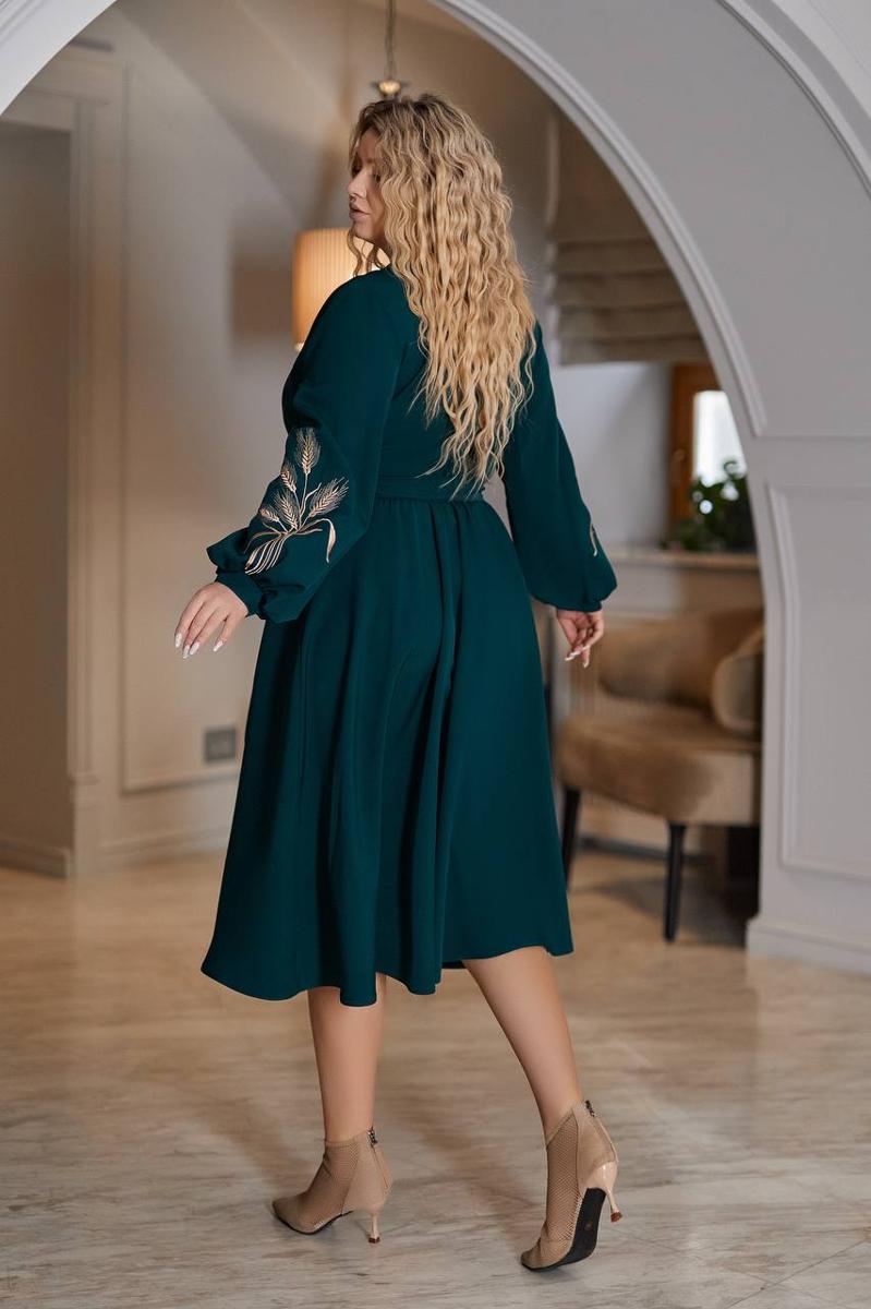 Elegantiška suknelė su surišimu, harmoningai derinanti rafinuotą dizainą ir tradicinį ukrainietišką siuvinėjimą. Ši įspūdinga vidutinio ilgio suknelė sodrios žalios spalvos puošta subtiliu kviečių siuvinėjimu auksiniais atspalviais ant rankovių – išskirtinis drabužis ypatingoms progoms ir stilingiems renginiams.