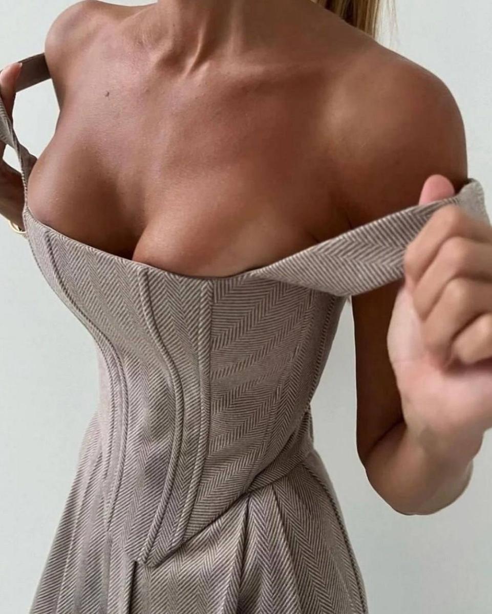 - Design: Structured corset with open back, tailored blazer, wide-leg trousers