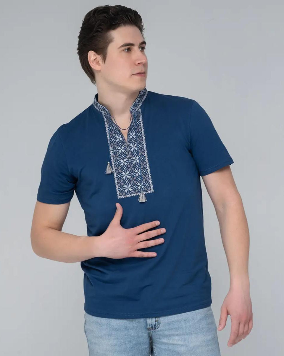 Atraskite tradicijos stiprybę su „Syla Rodu“ marškinėliais – šiuolaikine ukrainietiško paveldo interpretacija. Sudėtingas pilkų ir baltų atspalvių siuvinėjimas ant sodrios mėlynos bazės simbolizuoja kultūrinį pasididžiavimą, išlaikant maksimalų komfortą kasdieniam dėvėjimui.