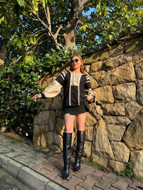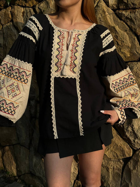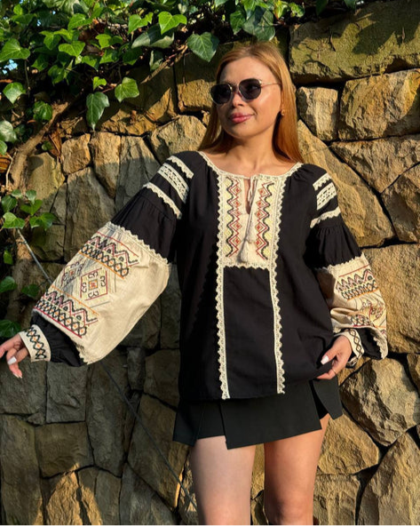 Pagaminta iš natūralaus audinio, užtikrinančio komfortą ir kvėpavimą, ši vyšyvanka puošta juoda geometrine siuvinėjimo technika, papildyta subtiliomis nėrinių detalėmis. Apimties rankovės su siuvinėtomis rankogaliais suteikia moteriškumo ir etninės elegancijos, o iškirptė su dekoratyvinėmis virvelėmis ir kutais leidžia reguliuoti jos gylį.