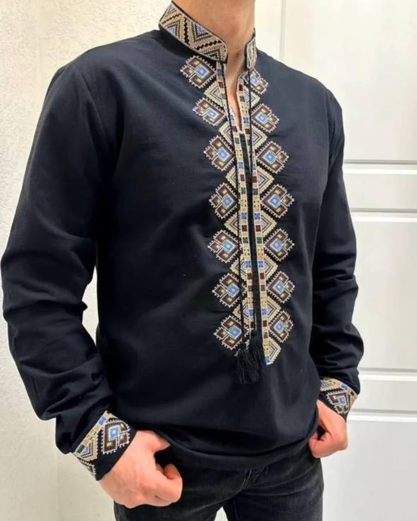 - Design: Traditional geometric embroidery, stand collar, long sleeves