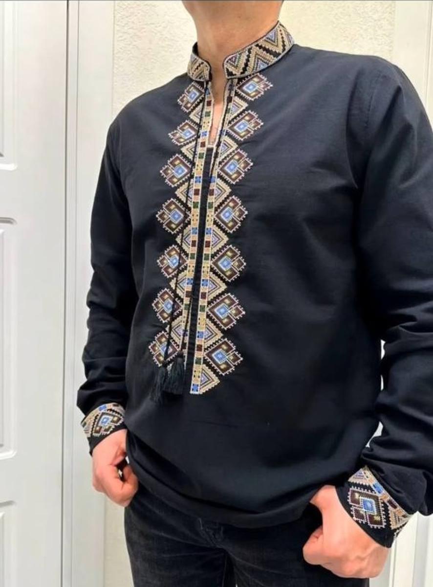 Amžina siuvinėtų marškinių klasika, įkūnijanti rafinuotą ukrainietišką paveldą ir modernų universalumą 💫 Šie klasikiniai juodi medvilniniai marškiniai puošiami sudėtinga geometrine siuvinėjimo kompozicija sodrių mėlynų, rudų ir aukso atspalvių tonų, sukuriant elegantišką ir išraiškingą įvaizdį, tinkantį bet kuriai progai. Premium klasės natūrali medvilnė užtikrina ypatingą komfortą ir kvėpavimą, o rafinuota juoda bazė suteikia šiuolaikišką akcentą šiam autentiškam kultūros kūriniui ✨