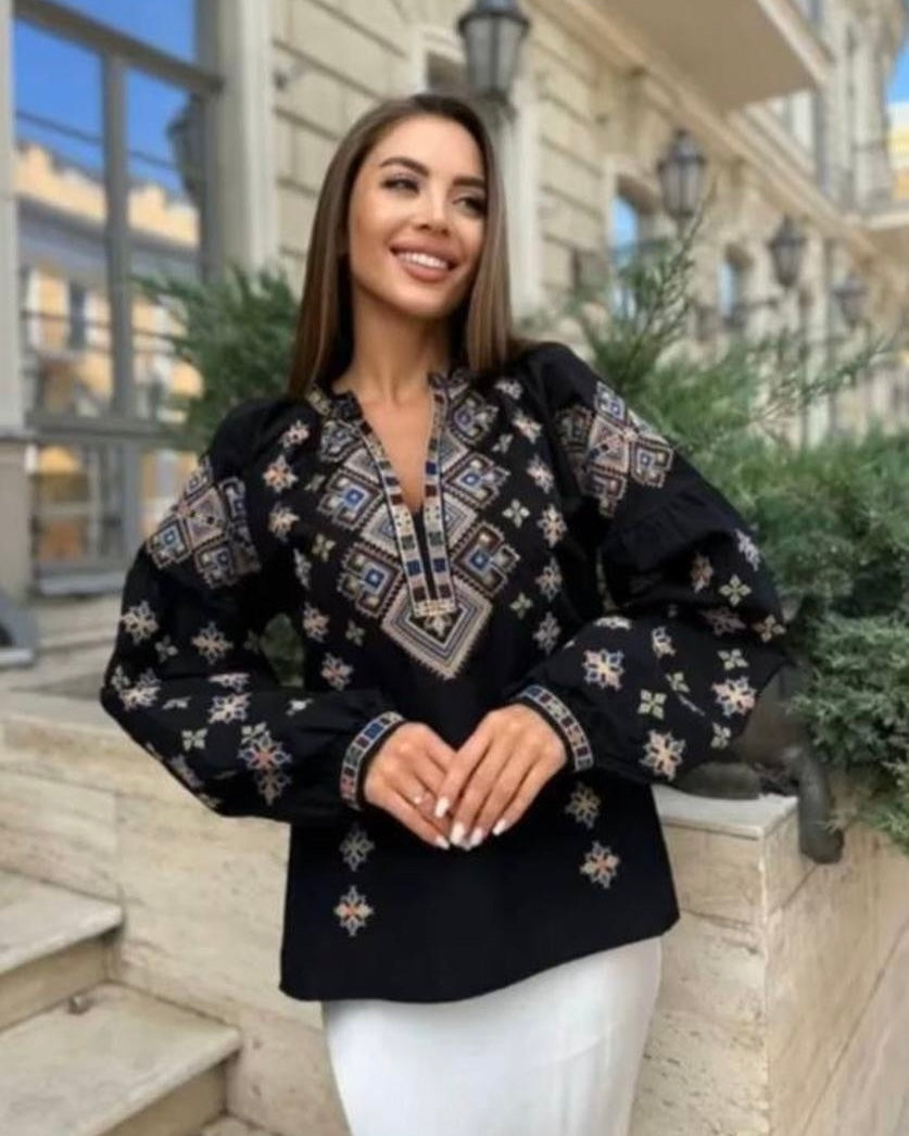 Amžina siuvinėta palaidinė, derinanti rafinuotą ukrainietišką paveldą su moderniu universalumu. Klasikinė juoda medvilninė vyšyvanka pasižymi tradiciniu siuvinėjimu, kuris sukuria elegantišką siluetą, tinkantį bet kokiai progai. Aukštos kokybės natūrali medvilnė užtikrina išskirtinį komfortą ir kvėpavimą, o sodri juoda spalva suteikia šiuolaikiško žavesio autentiškam kultūriniam drabužiui.