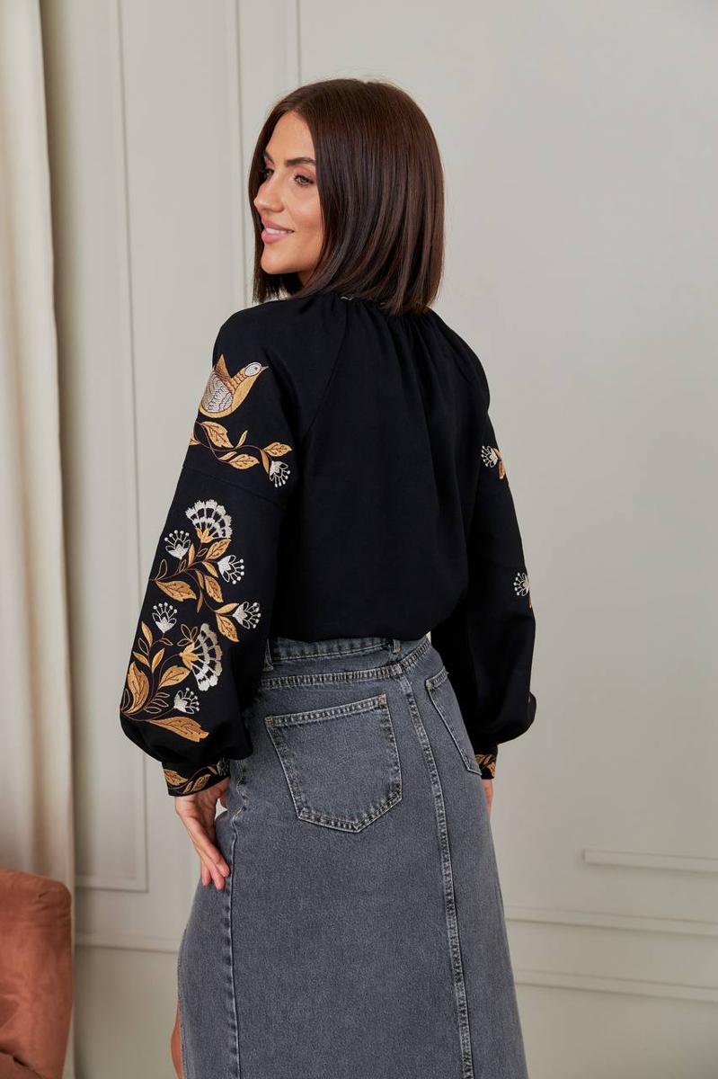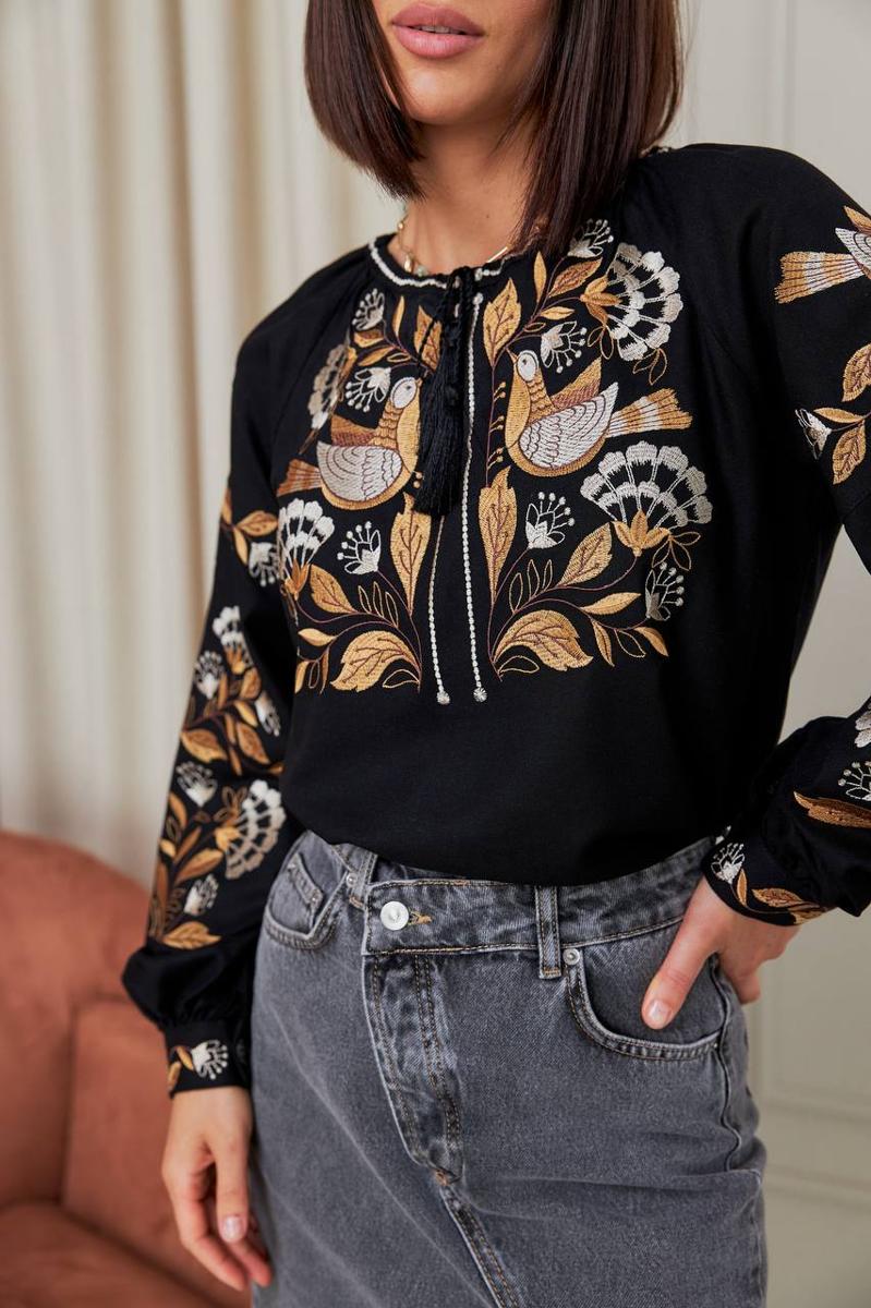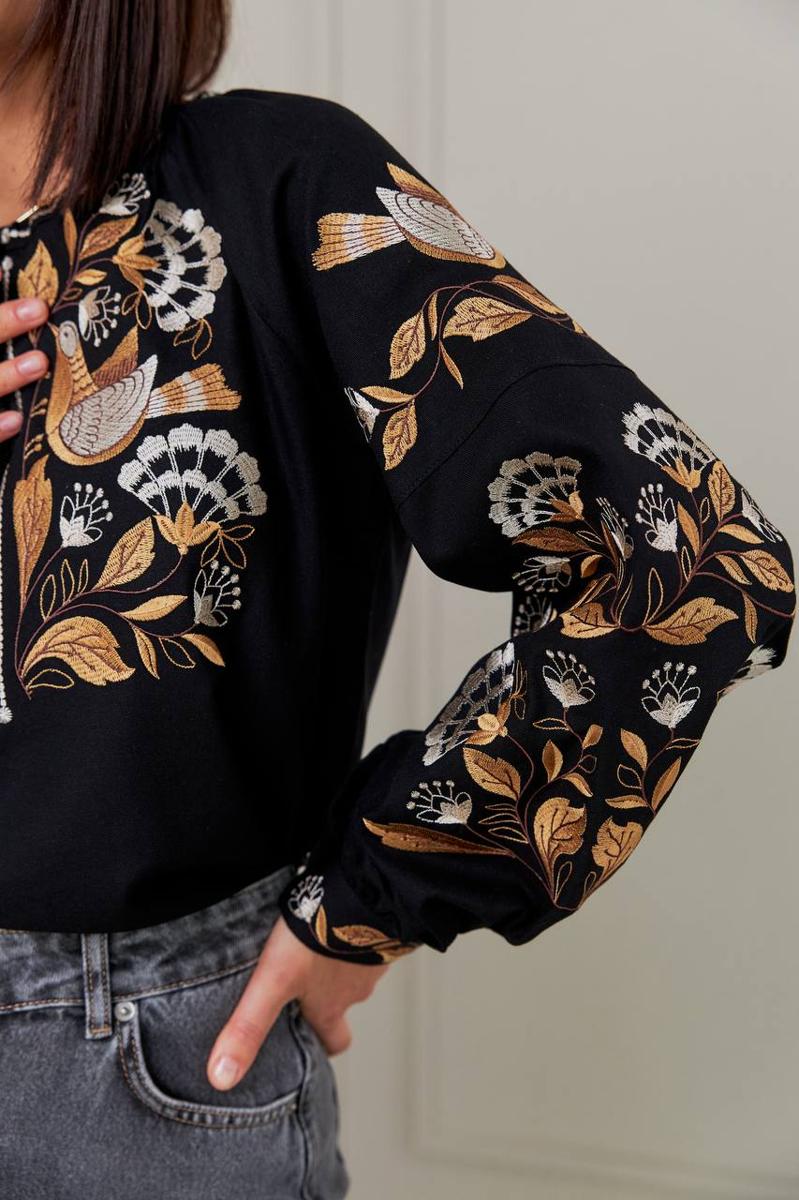 Išskirtinė siuvinėta palaidinė, perteikianti gamtos grožį per meistrišką rankų darbą. Ši elegantiška juoda vyšyvanka puošta prabangiu šilkiniu siuvinėjimu, vaizduojančiu subtilius paukščius ir augalų motyvus auksiniais bei kreminiais atspalviais. Kontrastas su sodriu juodu audiniu sukuria rafinuotą, prabangų įvaizdį, atspindintį išskirtinį skonį ir meistrystę.