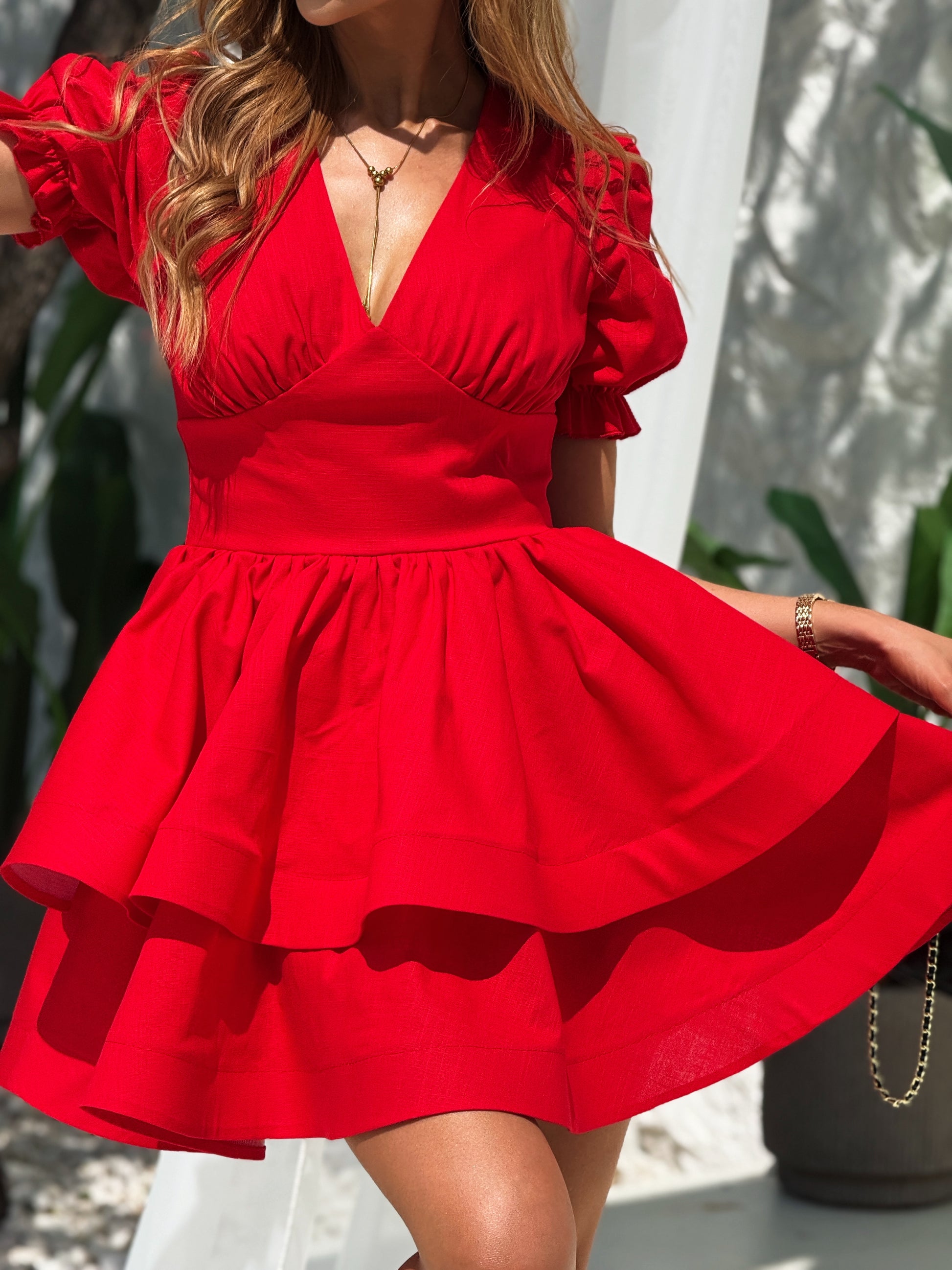 Prigludęs viršus su gilia iškirpte gražiai pabrėžia dekoltė ir liemenį, o apimties rankovės suteikia švelnumo. Daugiaaukštis sijonas kuria lengvumo ir judesio pojūtį, todėl kiekvienas žingsnis atrodo ypač grakštus.