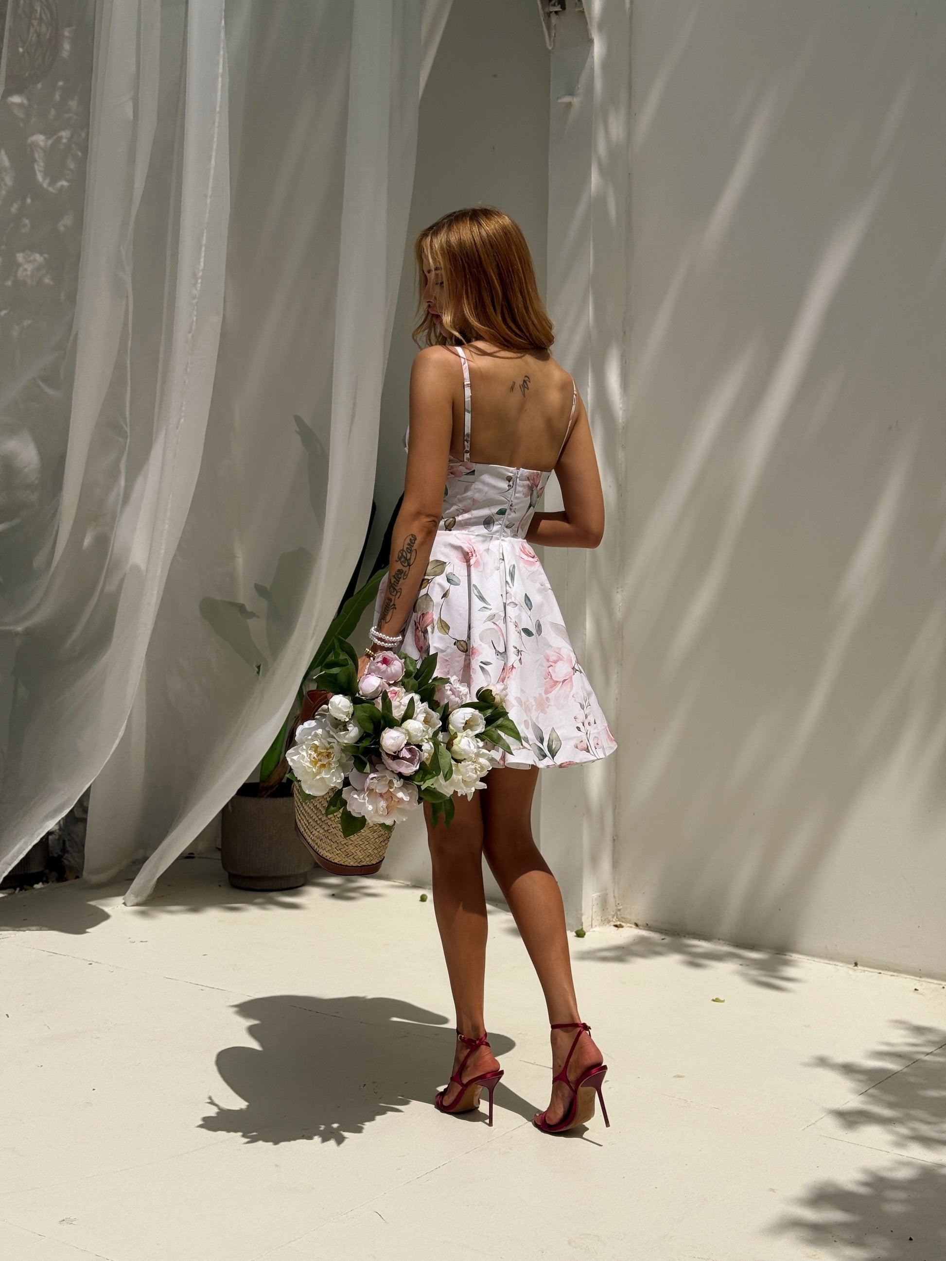 Prigludęs viršus su gilia iškirpte gražiai pabrėžia dekoltė ir liemenį, o platėjantis sijonas suteikia lengvumo ir moteriškumo. Gėlių raštas suteikia įvaizdžiui gaivumo ir ypatingo žavesio.