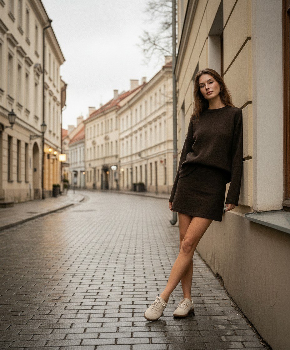- Kirpimas: minimalistinis tiesaus kirpimo megztinis ir trumpas sijonas su švariomis linijomis, kuriantys modernų, minimalistinį įvaizdį.
