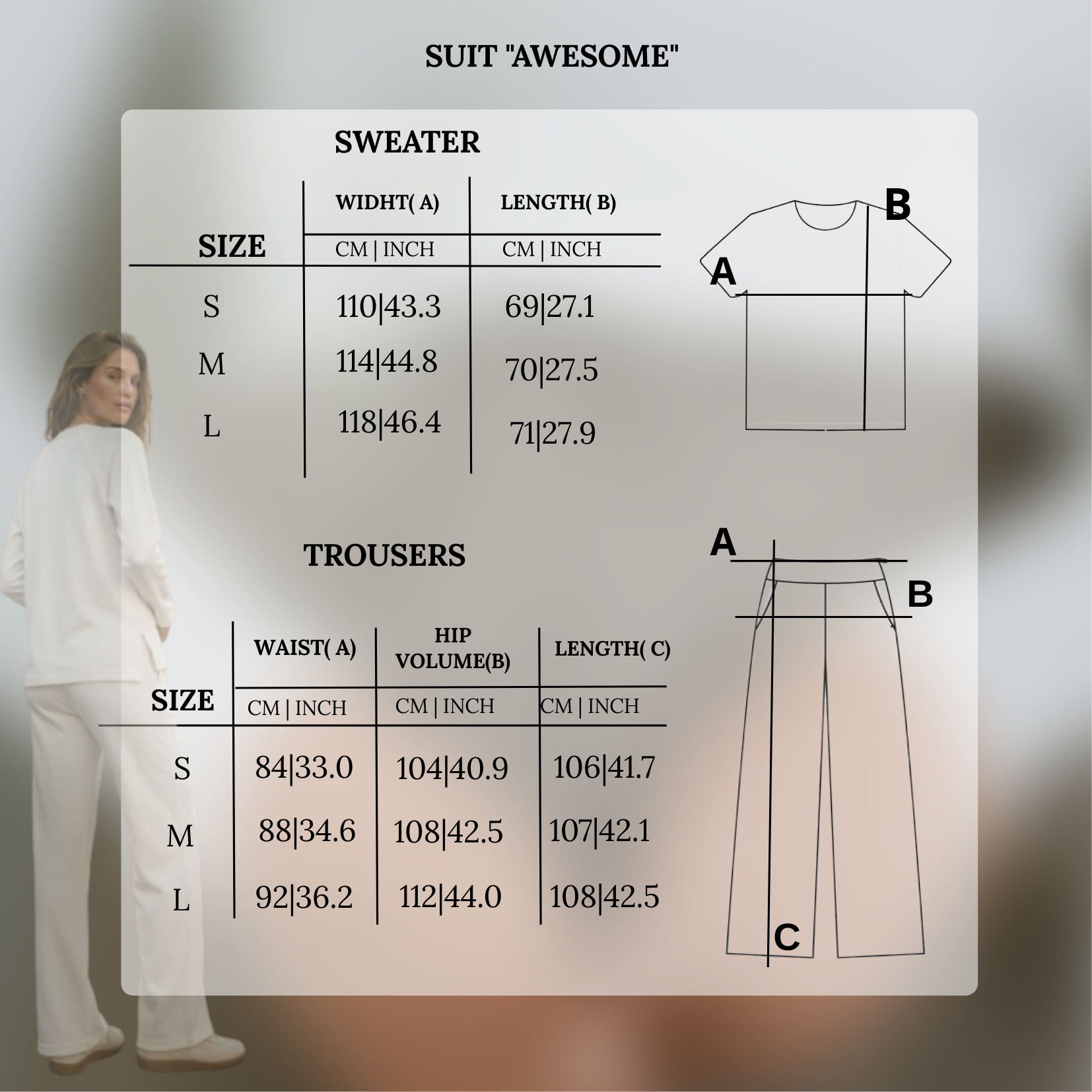 - Prigludimas: laisvas viršus ir tiesaus kirpimo patogaus ilgio kelnės.