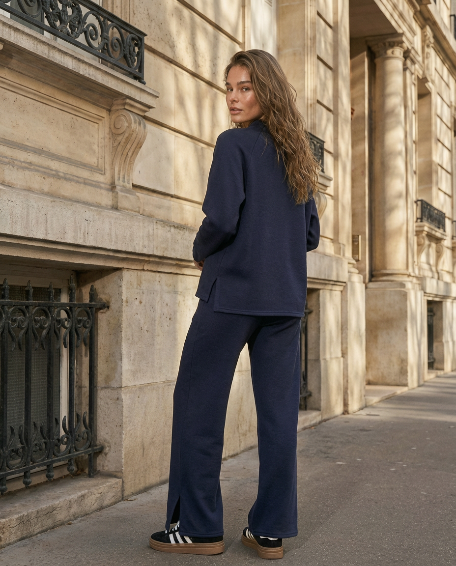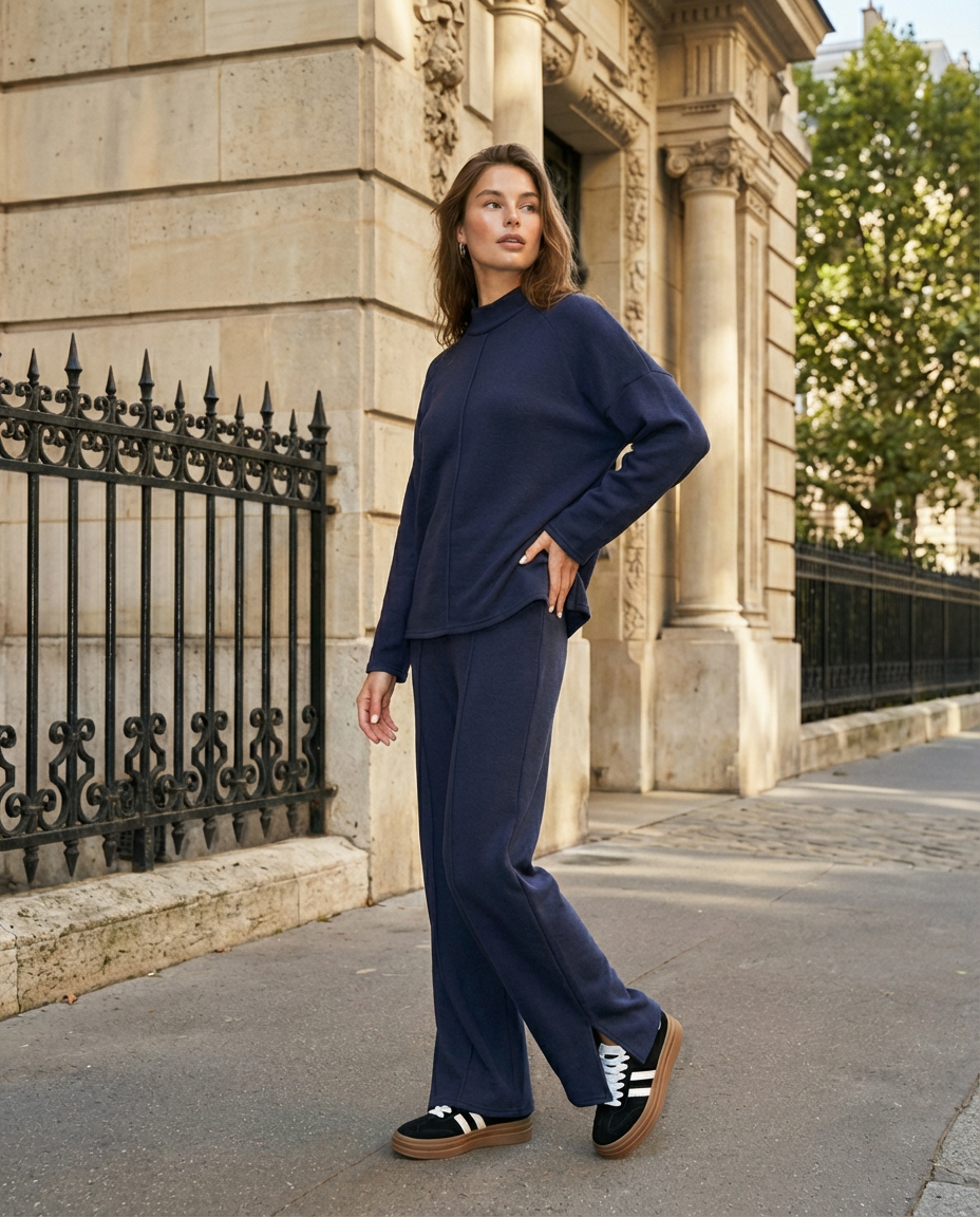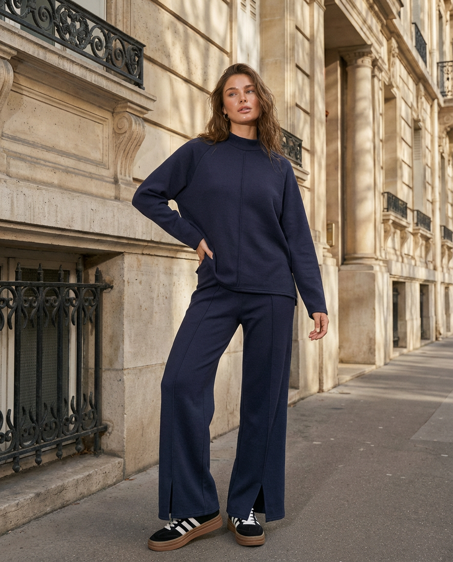 Komplektą sudaro viršus su apvalia iškirpte ir tiesaus kirpimo kelnės, kurios vizualiai pailgina siluetą ir gražiai priglunda prie figūros. Minimalistinis dizainas daro šį moterišką trikotažinį kostiumą universaliu — jį lengva derinti su sportbačiais, auliniais batais ir baziniais viršutiniais drabužiais.