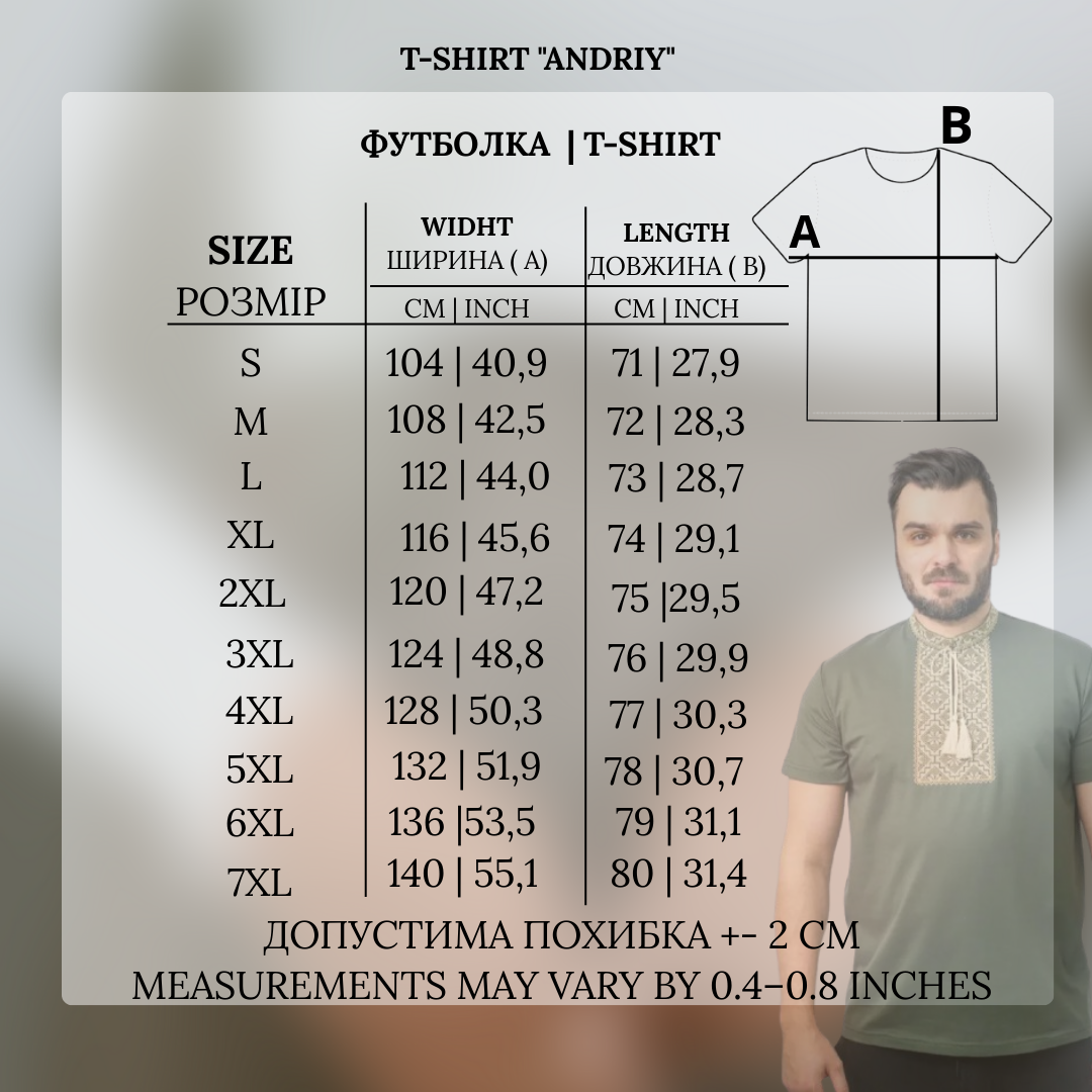 Atraskite stiprybės ir paveldo dvasią su „Andriy“ marškinėliais – šiuolaikiniu siuvinėtu modeliu, kuriame dera komfortas ir laiko patikrinta ukrainietiška tradicija. Gilios chaki spalvos pagrindas papuoštas subtiliu smėlio atspalvio siuvinėjimu, simbolizuojančiu ištvermę ir kultūrinį pasididžiavimą. Puikus pasirinkimas vyrams, vertinantiems stilių ir prasmę savo aprangoje.