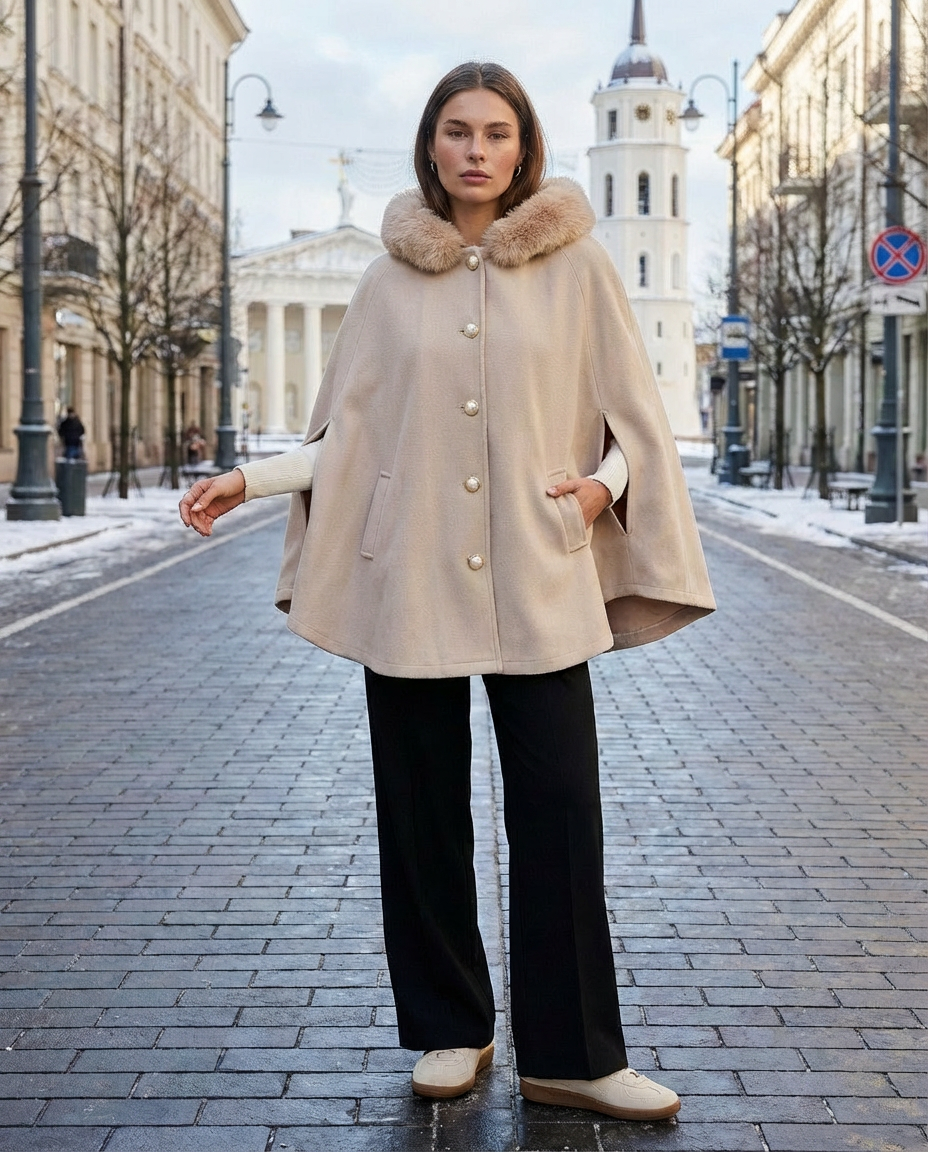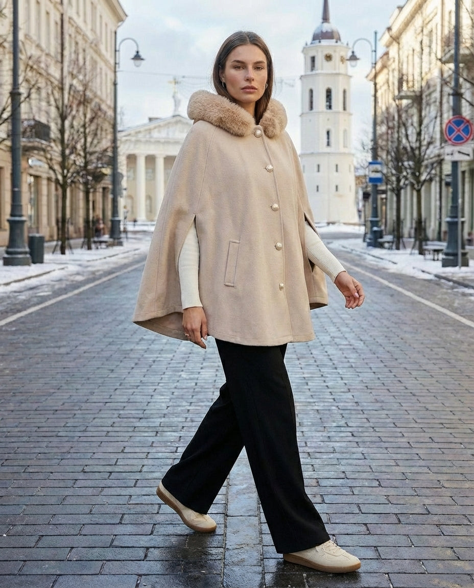 Залишайтеся в теплі та стилі з нашим розкішним бежевим пальто-пончо з капюшоном із м’якого штучного хутра.
