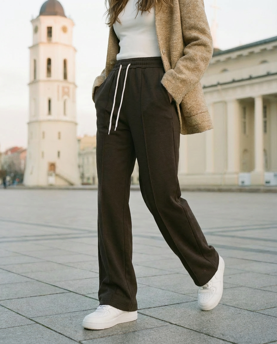 Штани м’яко підкреслюють лінію стегон і візуально створюють привабливий силует ззаду без надмірного облягання. Вертикальні смужки вздовж штанин створюють ефект довших ніг, додаючи стрункості та подовженості. Прямий крій із легким розкльошенням донизу врівноважує пропорції, а регульований еластичний пояс забезпечує комфорт без тиску. Це універсальна річ для міського способу життя — охайна зовнішність і водночас надзвичайно зручна для носіння.