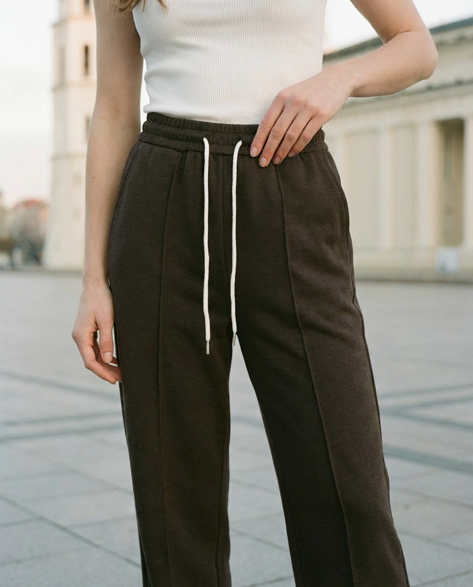 - Крій: Штани з прямими штанинами, трохи розкльошені донизу, з декоративними вертикальними швами, що візуально подовжують ноги.