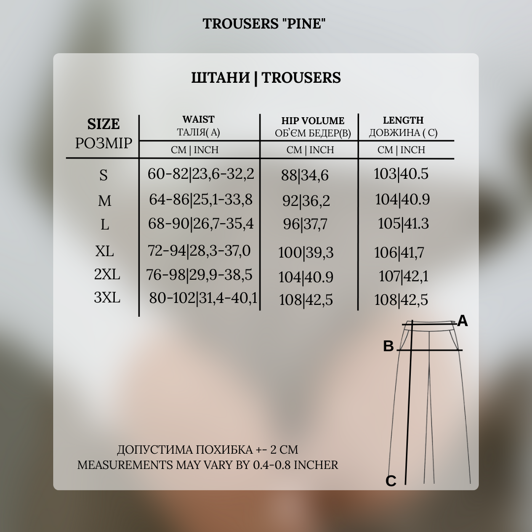 - Крій: Штани з прямими штанинами, трохи розкльошені до низу, з декоративними вертикальними швами, які візуально подовжують ноги.