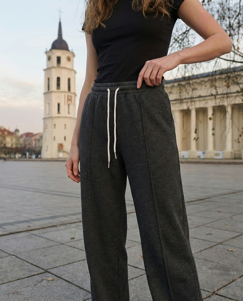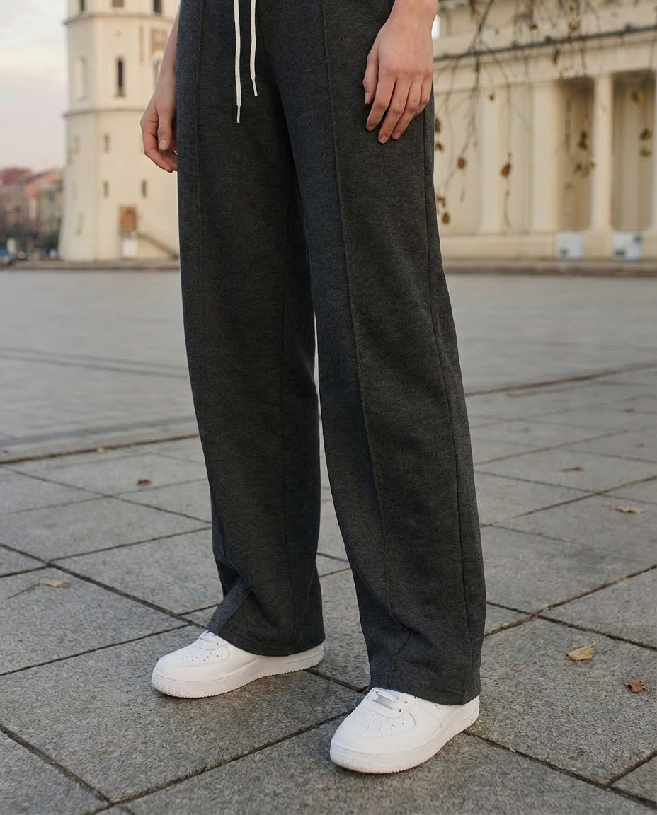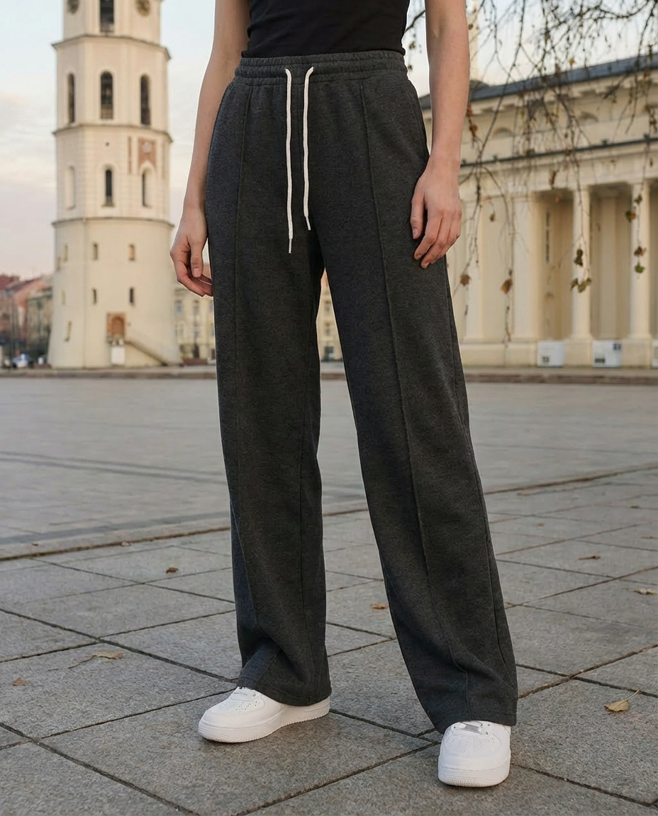 Штани м’яко підкреслюють лінію стегон і візуально створюють привабливий силует ззаду без надмірного прилягання. Вертикальні смуги вздовж штанин створюють ефект подовжених ніг, надаючи стрункішого та більш витягнутого вигляду. Прямий крій з невеликим розкльошенням до низу врівноважує пропорції, а регульований еластичний пояс забезпечує комфорт без тиску. Це універсальна річ для міського стилю — охайна на вигляд, але надзвичайно зручна у носінні.