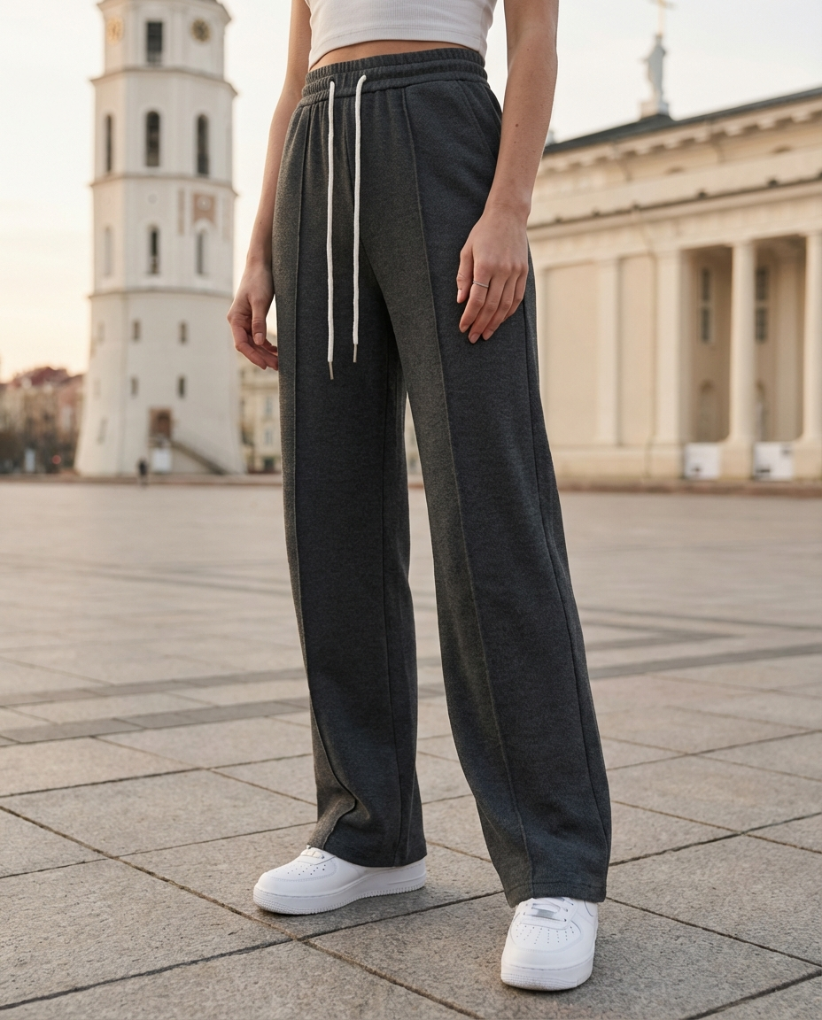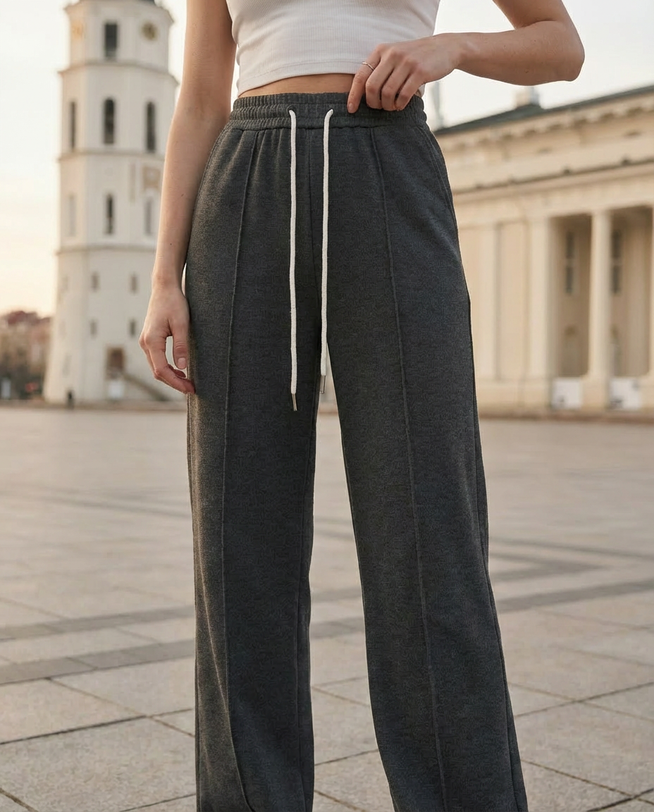 Штани м’яко підкреслюють лінію стегон і візуально створюють привабливий силует ззаду без надмірного прилягання. Вертикальні смуги вздовж штанин створюють ефект подовжених ніг, надаючи стрункішого та більш витягнутого вигляду. Прямий крій з невеликим розкльошенням до низу врівноважує пропорції, а регульований еластичний пояс забезпечує комфорт без тиску. Це універсальна річ для міського стилю — охайна на вигляд, але надзвичайно зручна у носінні.