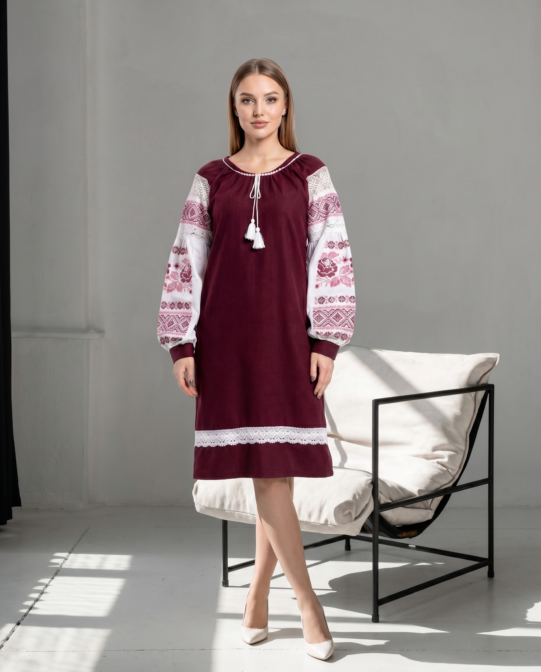 Decorative tassels at the neckline and lace detailing at the hem add elegance and authenticity. The combination of minimalist design and rich embroidery makes this dress perfect for both everyday wear and special occasions.