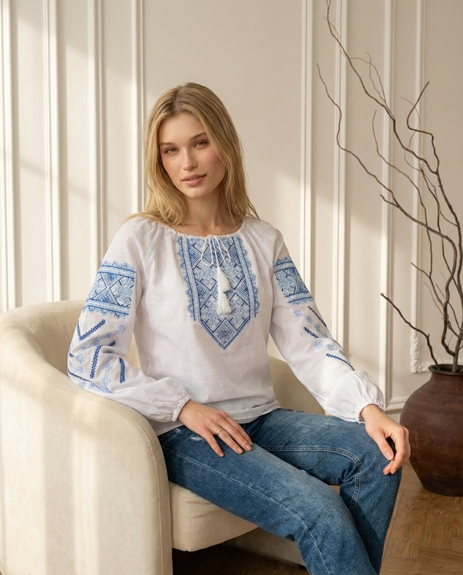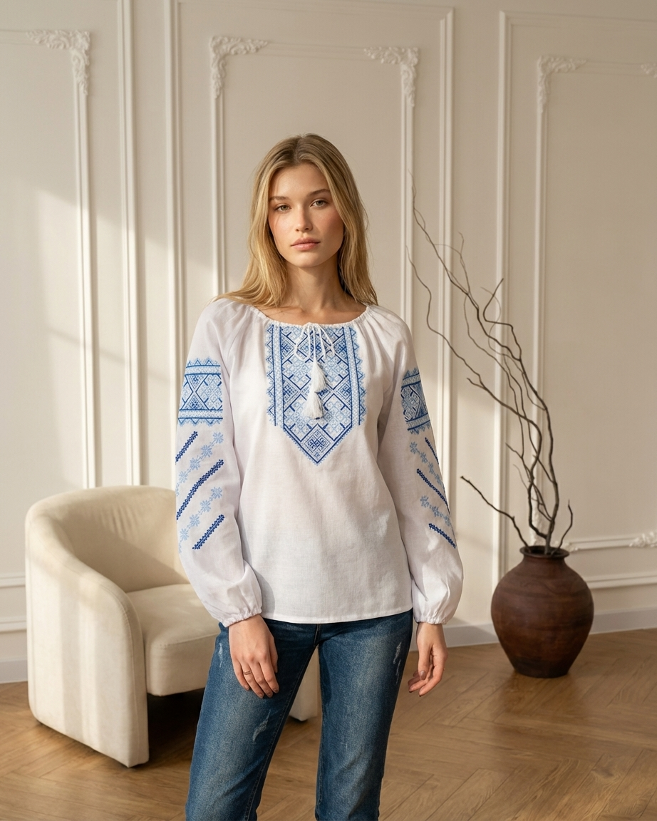 Акуратна симетрична вишивка створює гармонійний акцент на грудях та рукавах, підкреслюючи жіночність образу. Легка силуетна форма забезпечує комфорт і свободу рухів, а декоративні кисті додають особливого шарму.