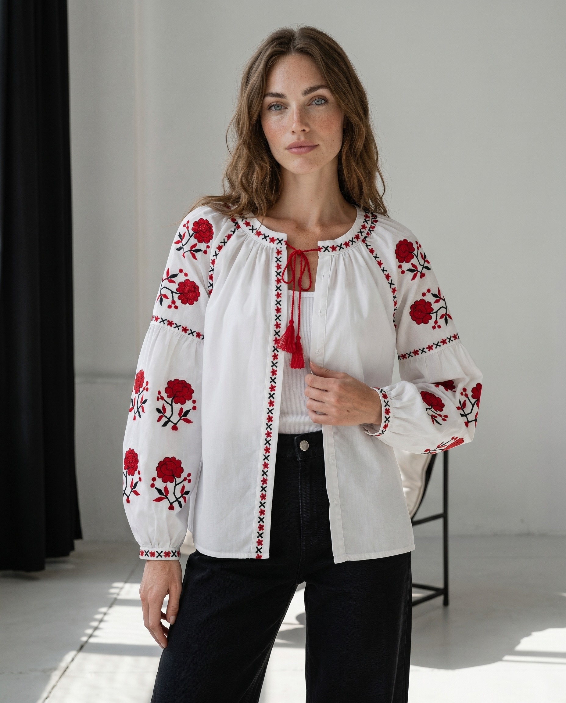 A delicate buttonless vyshyvanka that softly accentuates the silhouette, adding texture and lightness without overdoing the look.